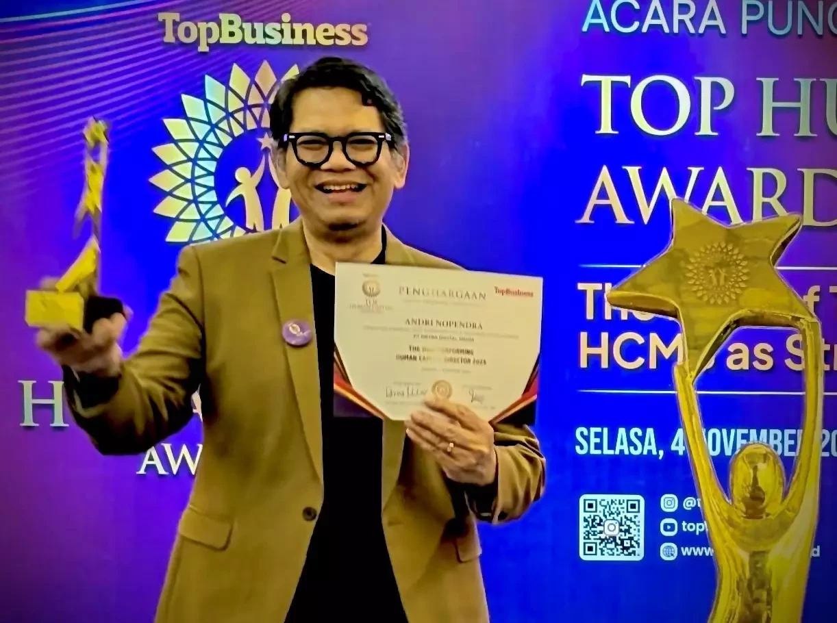 Penghargaan diterima oleh Andri Nopendra, Direktur Keuangan dan Manajemen Risiko MDMedia serta Ibnu Sudarmono, Vice President Human Capital Management MDMedia dalam ajang penganugerahan TOP HC Awards 2025 yang diselenggarakan di Raffles Hotel Jakarta.